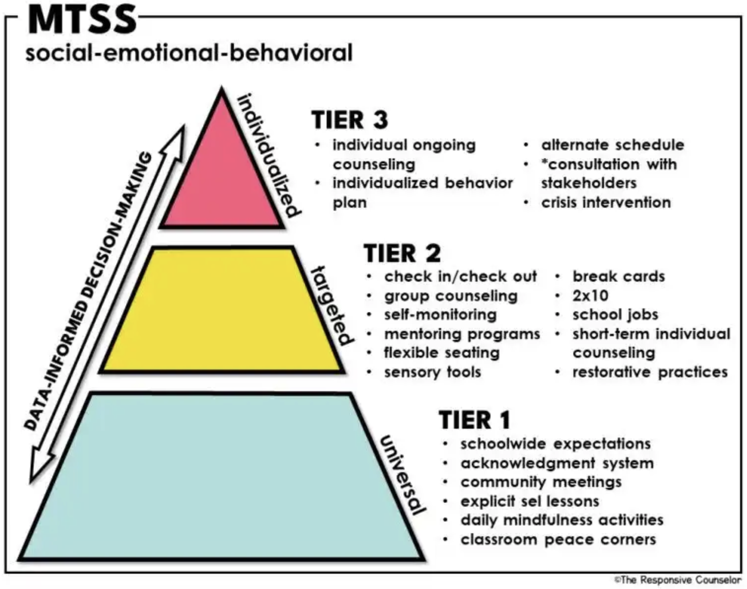 Using the most current best practices, strategic teams are trained to positively impact behavior at three key behavioral tiers: Universal or primary (whole school); Secondary (individual child or group of at-risk children); and Tertiary or Intensive (children with complex needs and behaviors that severely impact the child, school and/or community functioning).